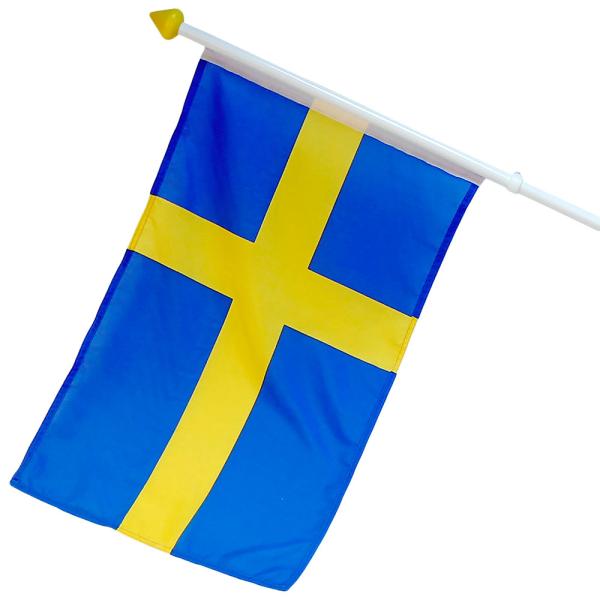 Svensk Facadeflag består af et 70x45cm stort blå-gult flag i stofmateriale og en 125cm lang hvid stang med en holder, som du nemt kan sætte op.