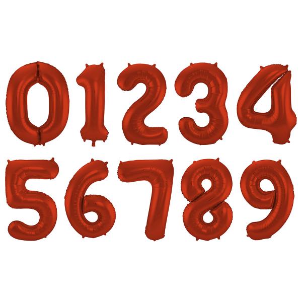 Talballon Rød Matt Metallic omfatter en folieballon formet som et tal i en mat nuance af rød metallic.