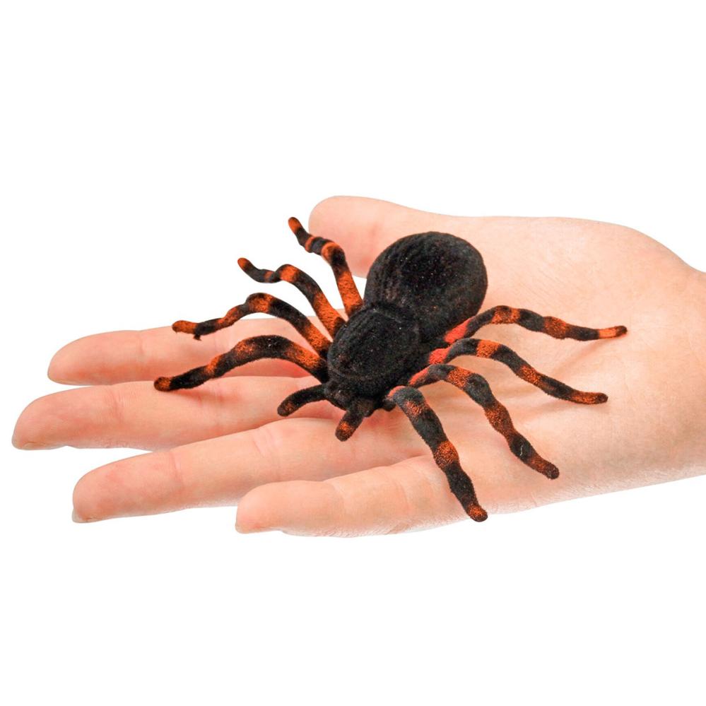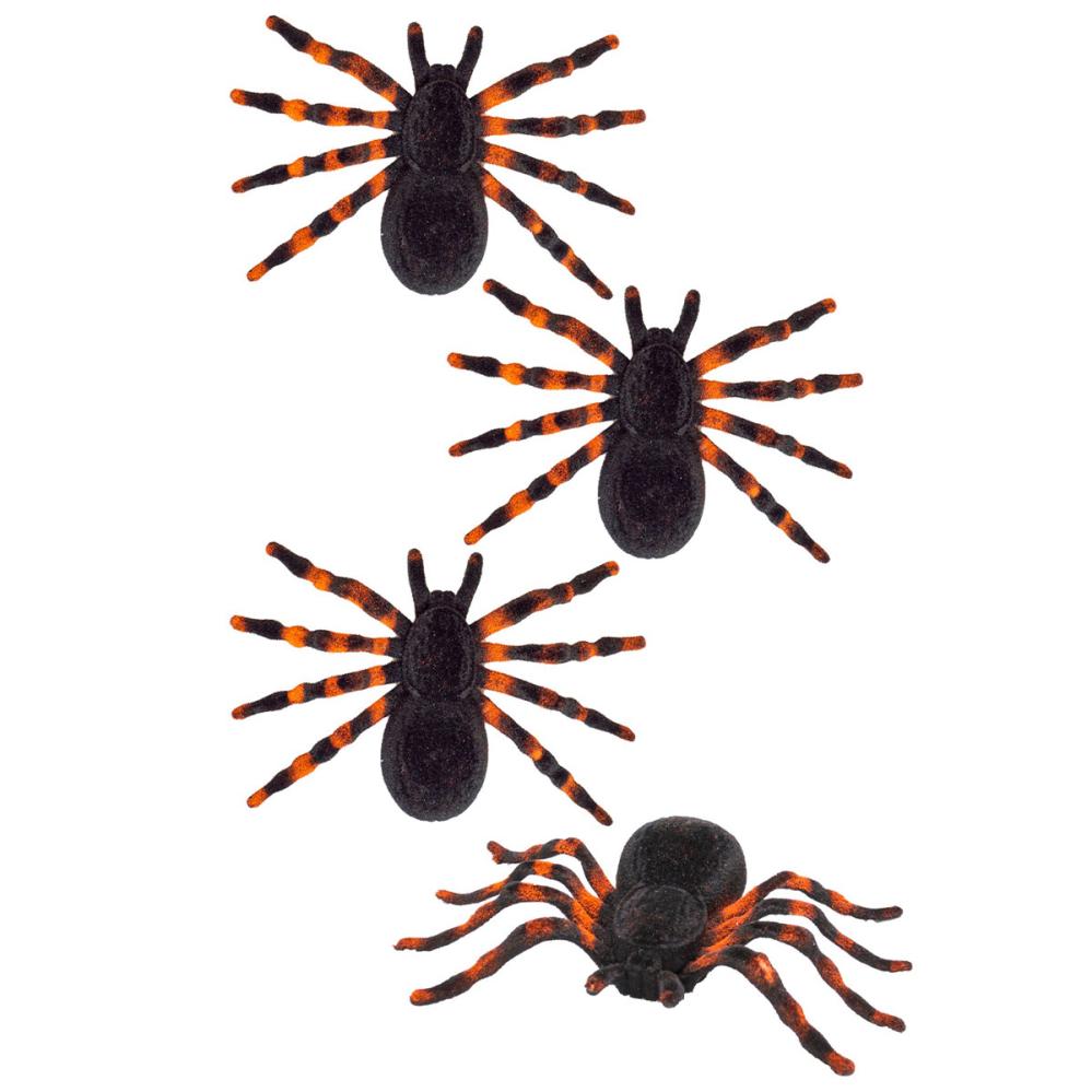 Taranteller 4-pak indeholder fire dekorative sorte taranteller klædt i fløjlslignende polyester med stribede ben i sort og brun.