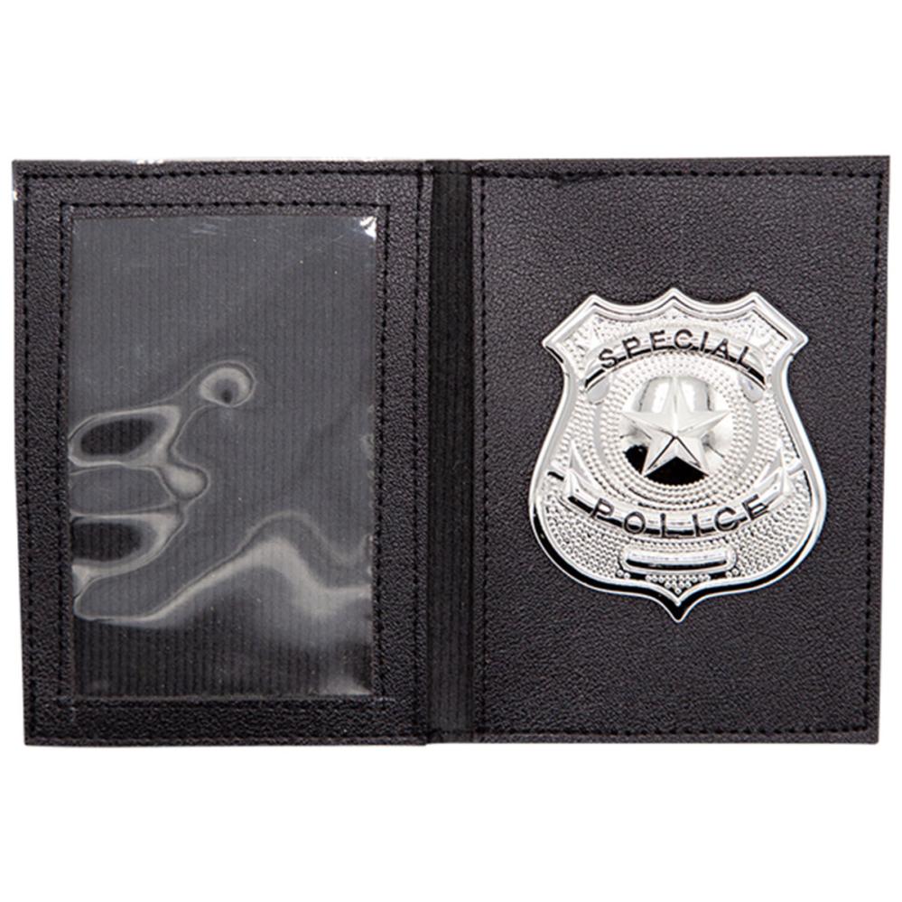 Tegnebog med Politiskilt består af en sort tegnebog med et sølvfarvet politiskilt med teksten "SPECIAL POLICE".