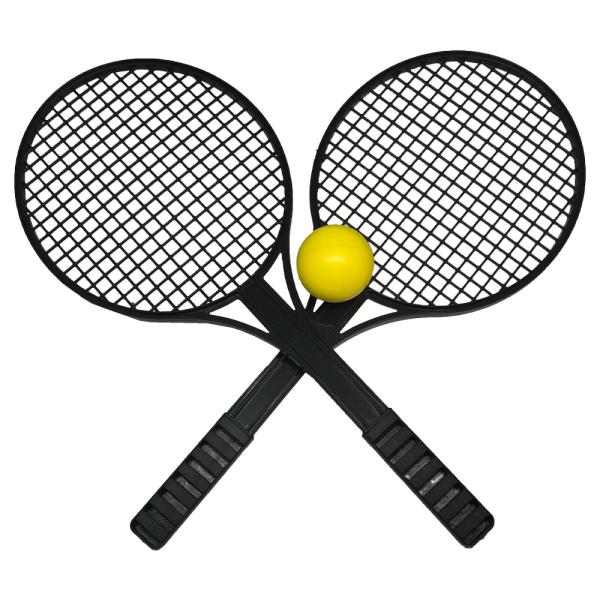 Tennis Sæt inkluderer et sæt med to tennis ketsjere i sort plast samt en gul, blød skumgummibold. Tennis ketsjerne er ca. 51 cm lange og passer fra ca. 5 år.