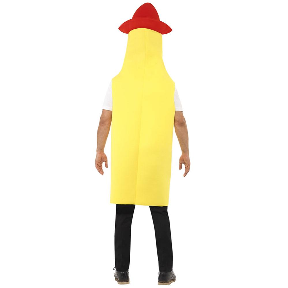 Tequila-flaske Kostume omfatter en gul heldragt i form af en tequilaflaske. Dragten har ærmehuller i siderne, en åbning til ansigtet og en rød sombreroformet flasketop. På den hvide og røde etiket står der "I'll Make You Happy", "EL TEQUILA" og lidt længere nede "Dare to taste my worm" under et billede af en slange.