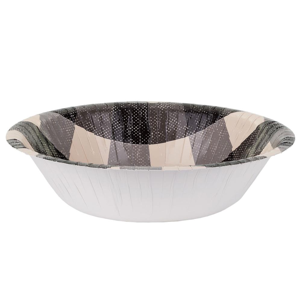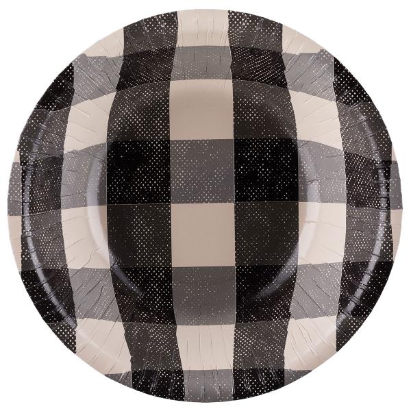 Ternede Papskåle Sort 6-pak består af seks dybe engangsskåle, som har et ternet motiv i farverne sort, grå og beige.