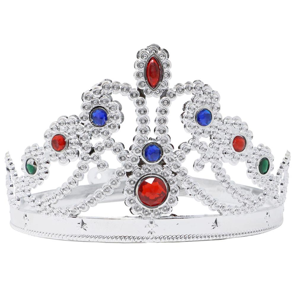 Denne elegante tiara i sølv er et perfekt valg til en polterabend eller kostumefest, hvor de funklende juveler i forskellige farver giver en ekstra touch af glamour og feststemning.