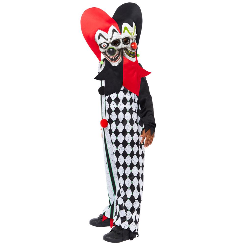 Toansigtet Gøgler Kostume Børn omfatter en sort og hvid heldragt med klassisk gøglermønster samt to dekorative pomponer foran i farverne rød og sort. Der medfølger også en uhyggelig gøglermaske med to ansigter, en sort og rød gøglerhat samt en stor, dekorativ krave. Masken har huller til øjnene samt åndehuller.