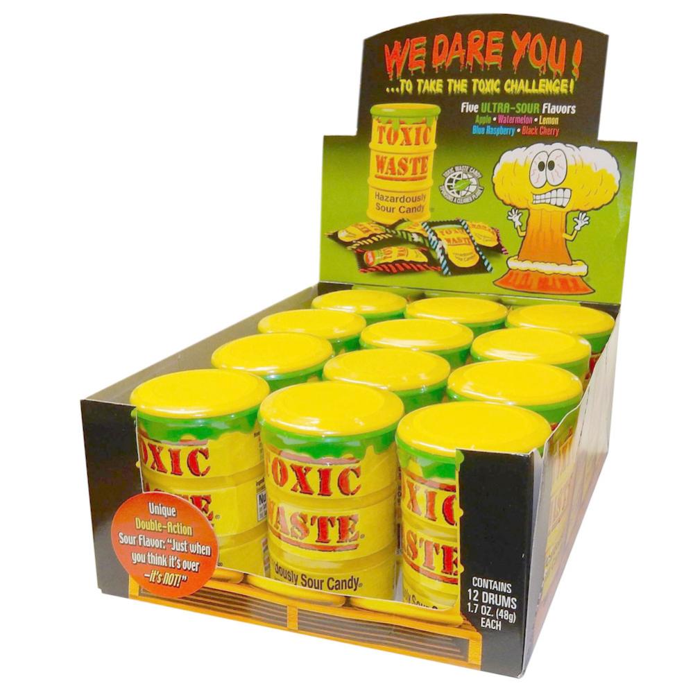 Toxic Waste Yellow Drum inkluderer en gul dåse, der forestiller en tønde med giftigt affald, som indeholder super surt slik med smagene citron, kirsebær, hindbær, vandmelon og æble.