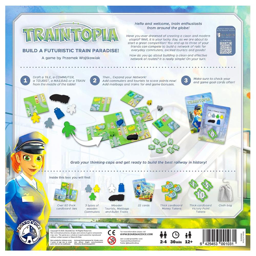 Traintopia Spil omfatter et spil, hvor 2-4 spillere konkurrerer om at bygge en futuristisk togparadis, et netværk af togskinner med ruter til pendlere, turister og varer. Mens du udvider, skal du samle sejrpoint og bonusser til slutspillet og holde øje med, hvad dine målkort viser, at du skal samle. Fra 12 år.