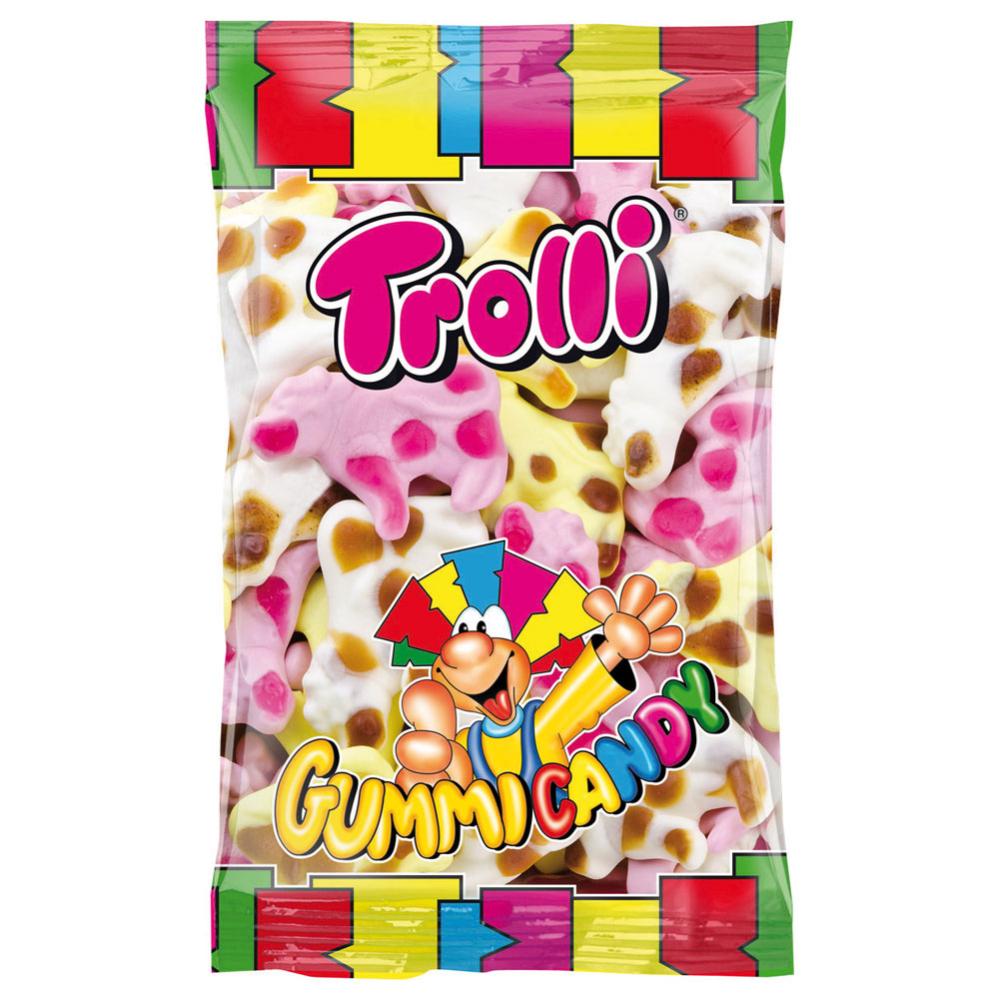 Trolli Mælkeko Slik 1 kg indeholder en stor pose skum- og gele-slik i form af køer med smag af frugt.