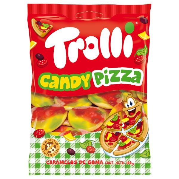 Trolli Pizza inkluderer en pose med skum- og geléslik i form af små pizzaer.