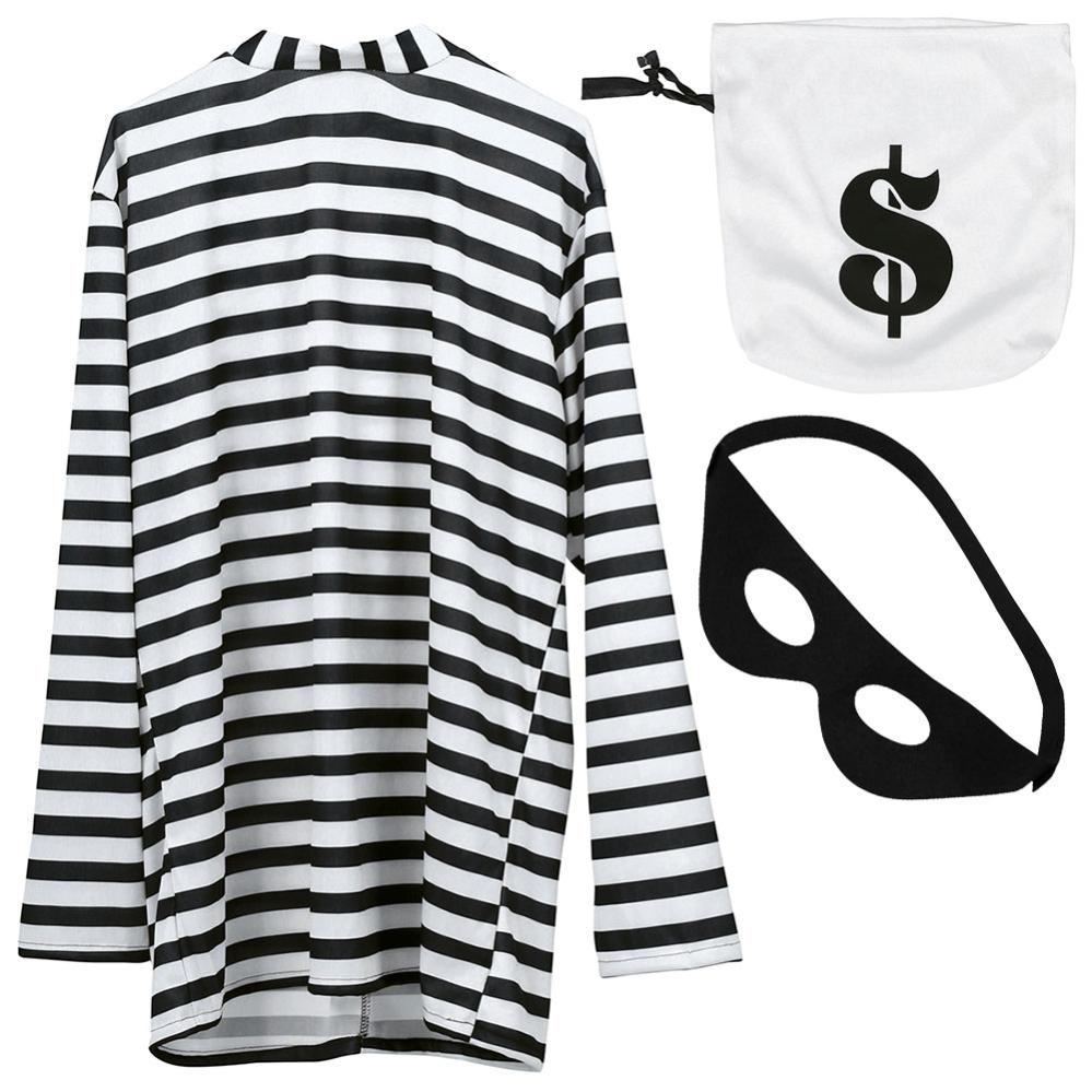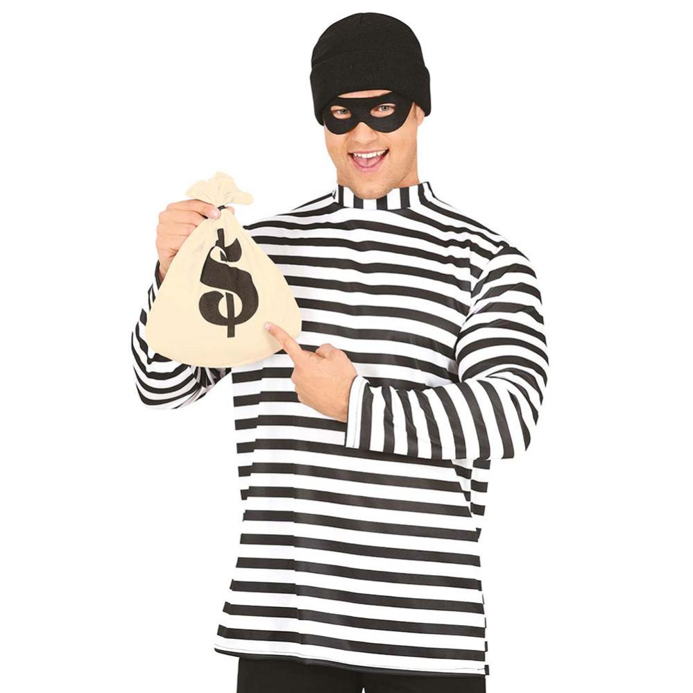 Tyv Kostume omfatter et kostume med motiv af en tyv. Dragten inkluderer en sort tyvemaske, en stribet trøje i sort og hvid samt en elfenbenshvid pengesæk med et sort dollartegn på.
