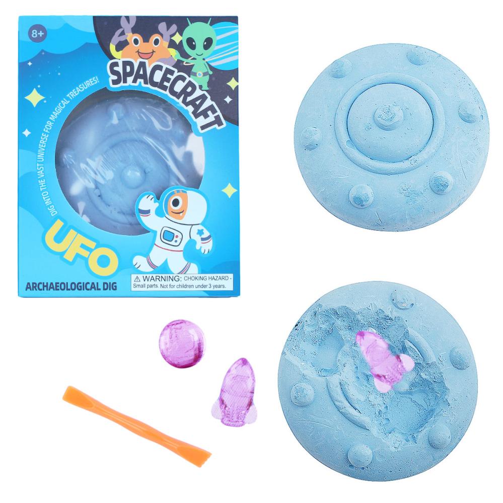 Udgravningssæt UFO omfatter en overraskelsespakke med en flyvende tallerken, som kan graves frem med det medfølgende graveværktøj for at finde to tilfældige ædelstene. Instruktioner findes på emballagen.