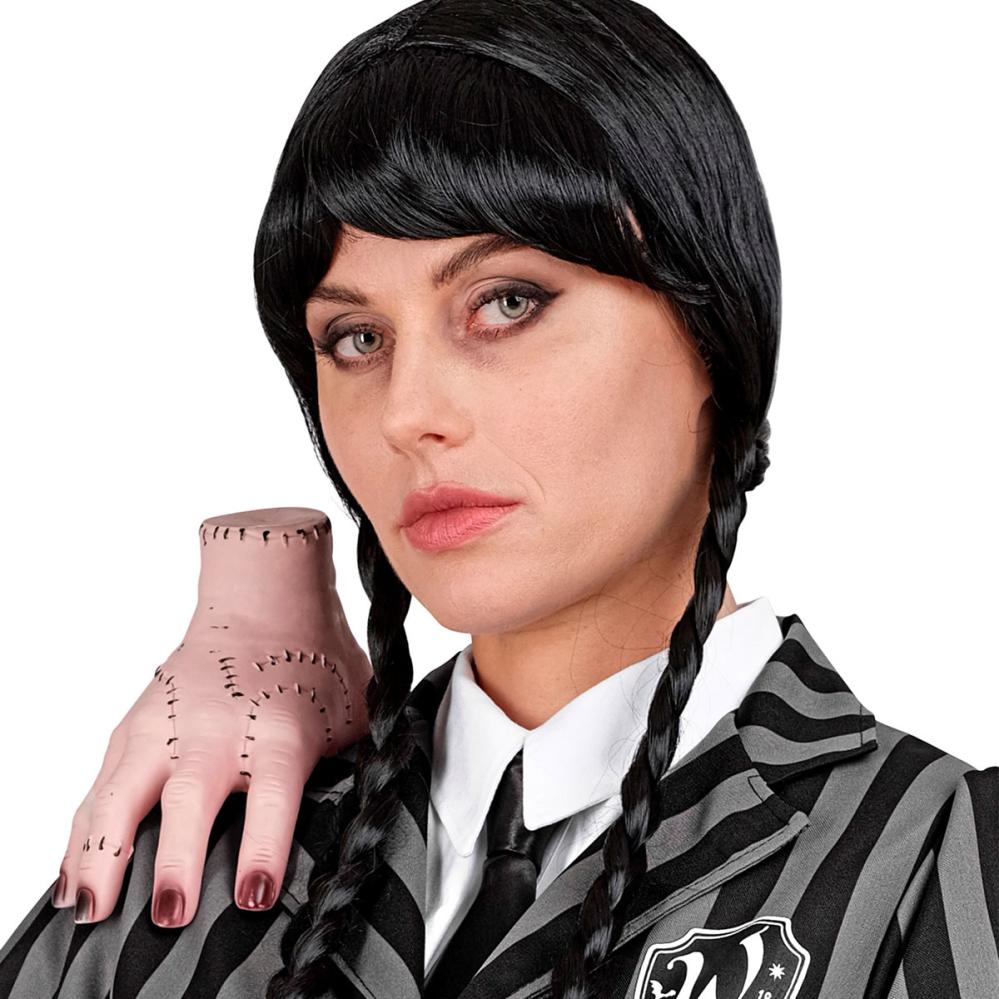 Uhyggelig Hånd med Sting omfatter en dekoration i form af en hånd i bleg lyserød med sorte sting og rødbrune negle.