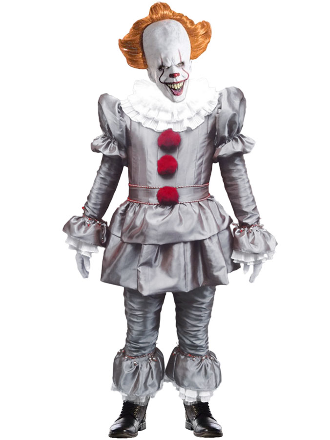 Det uhyggelige klovnekostume deluxe omfatter en detaljeret, metallic-brunfarvet cirkustrøje med en to-lags underdel, tre røde puffbolde langs forsiden og rynket, hvidt stof, der stikker ud fra ærmekanterne. Cirkustrøjen har en lynlås på bagsiden. Der medfølger også et par matchende bukser med elastik og benafslutninger, der har lag af hvidt stof i samme stil som trøjen. Der er også en flerlags hvid krave i rynket design.