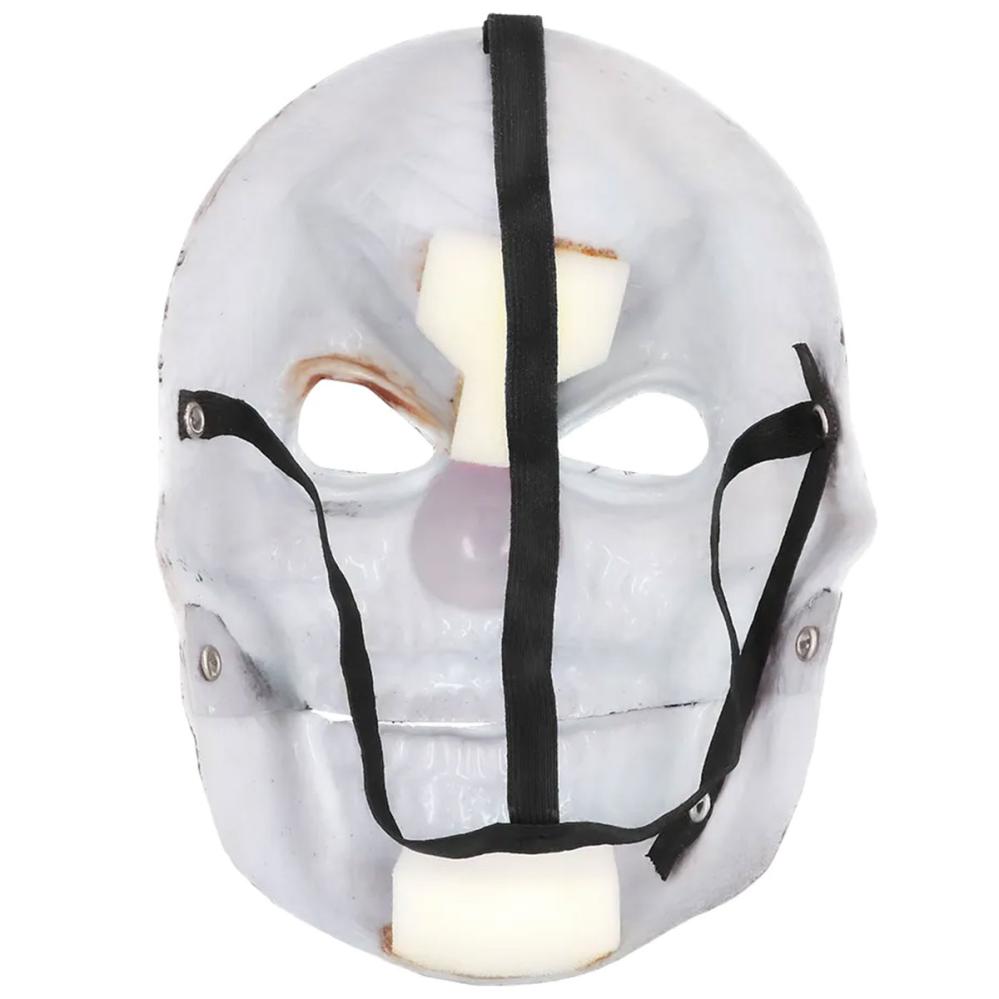 Uhyggelig Klovnemaske med Bevægelig Kæbe omfatter en klovnemaske i hvid og brun med sorte læber, rød næse samt sort farve omkring øjnene. Masken har huller til øjne og mund, bevægelig kæbe, skumpuder ved panden og hagen samt et sort elastisk bånd, der holder den på plads.