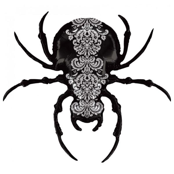 Uhyggelig Sort Edderkoppe Folieballon omfatter en sort folieballon formet som en edderkop med flotte hvide mønstre på. Kan fyldes med helium eller luft.