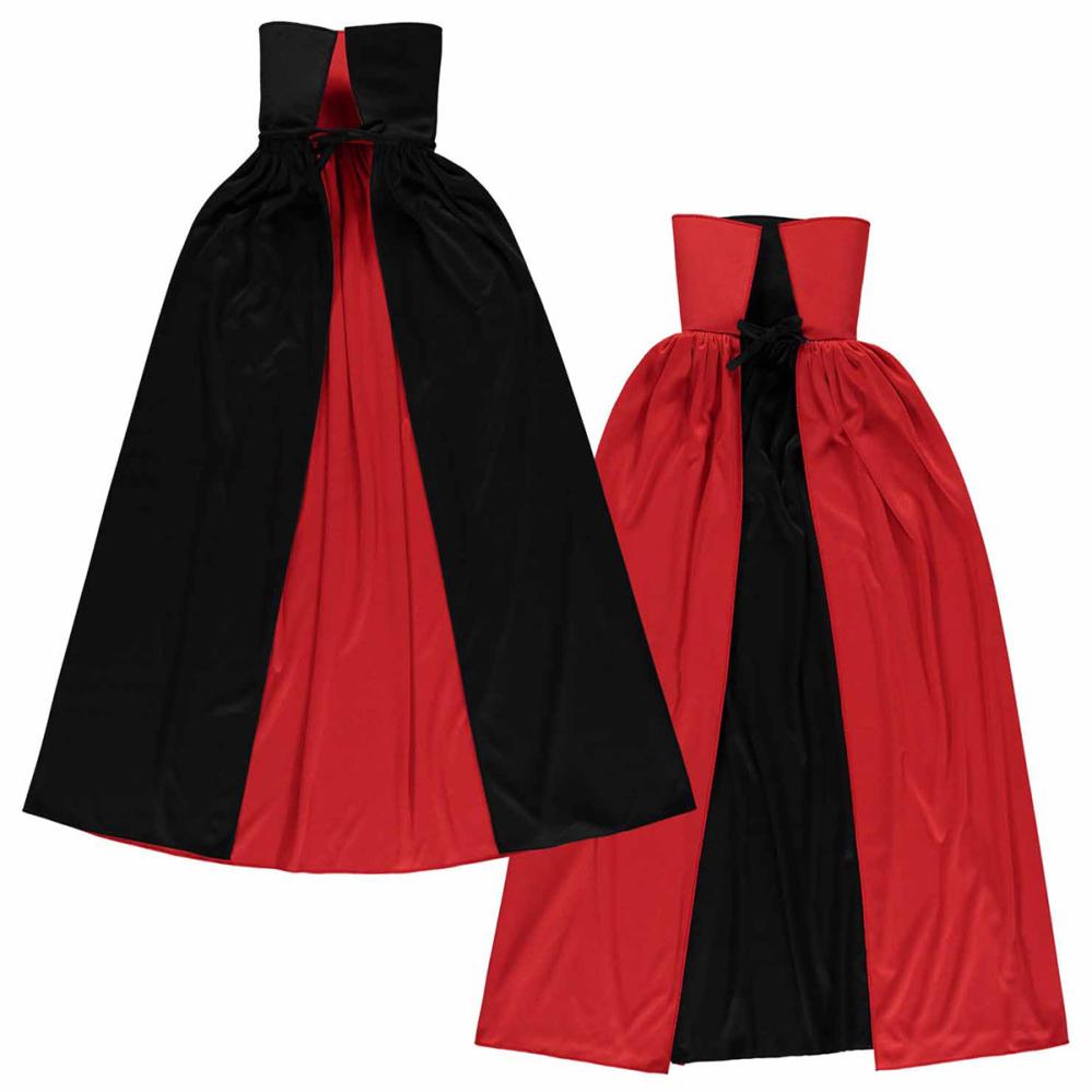Vendbar Vampyrcape med Krave omfatter en mellemlang, vendbar kappe med krave i farverne sort og rød. Kappen er forsynet med en praktisk snøring, der nemt bindes ved halsen.