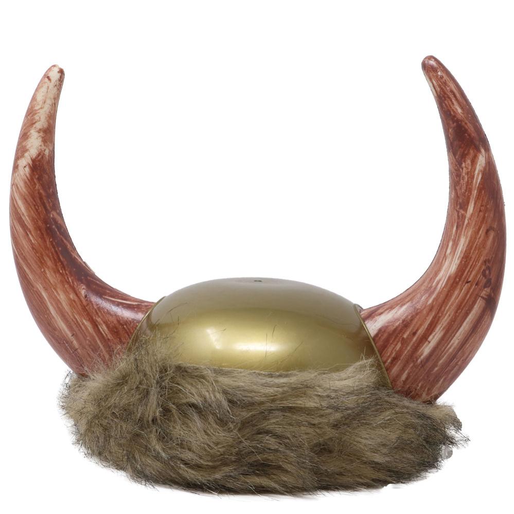 Vikingehjelm med Horn og Pelskant omfatter en vikingehjelm med to horn på hver side samt lysebrun kunstig pels rundt om nederkanten.