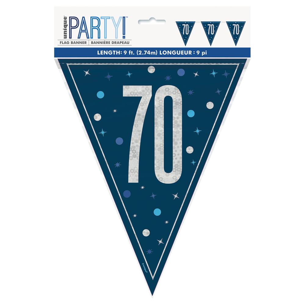 Vimpelguirlande 70 år Mørkeblå 2,74 m er en guirlande med vimpler. Hver vimpel har en holografisk sølvbagside og en mørkeblå forside med prikker, stjerner og tallet "70" i holografisk sølv.