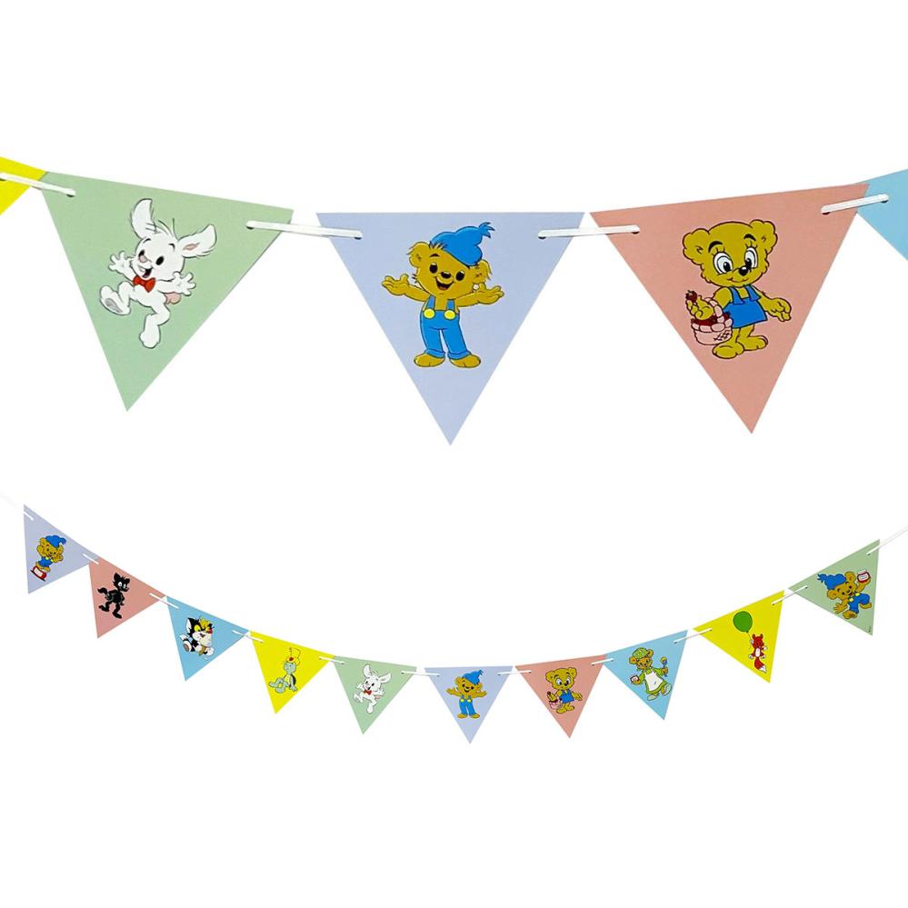 Vimpelguirlande Bamse omfatter en guirlande med ti vimpler i gult, grønt, blåt, rosa og lilla med motiver af forskellige karakterer fra Bamse.