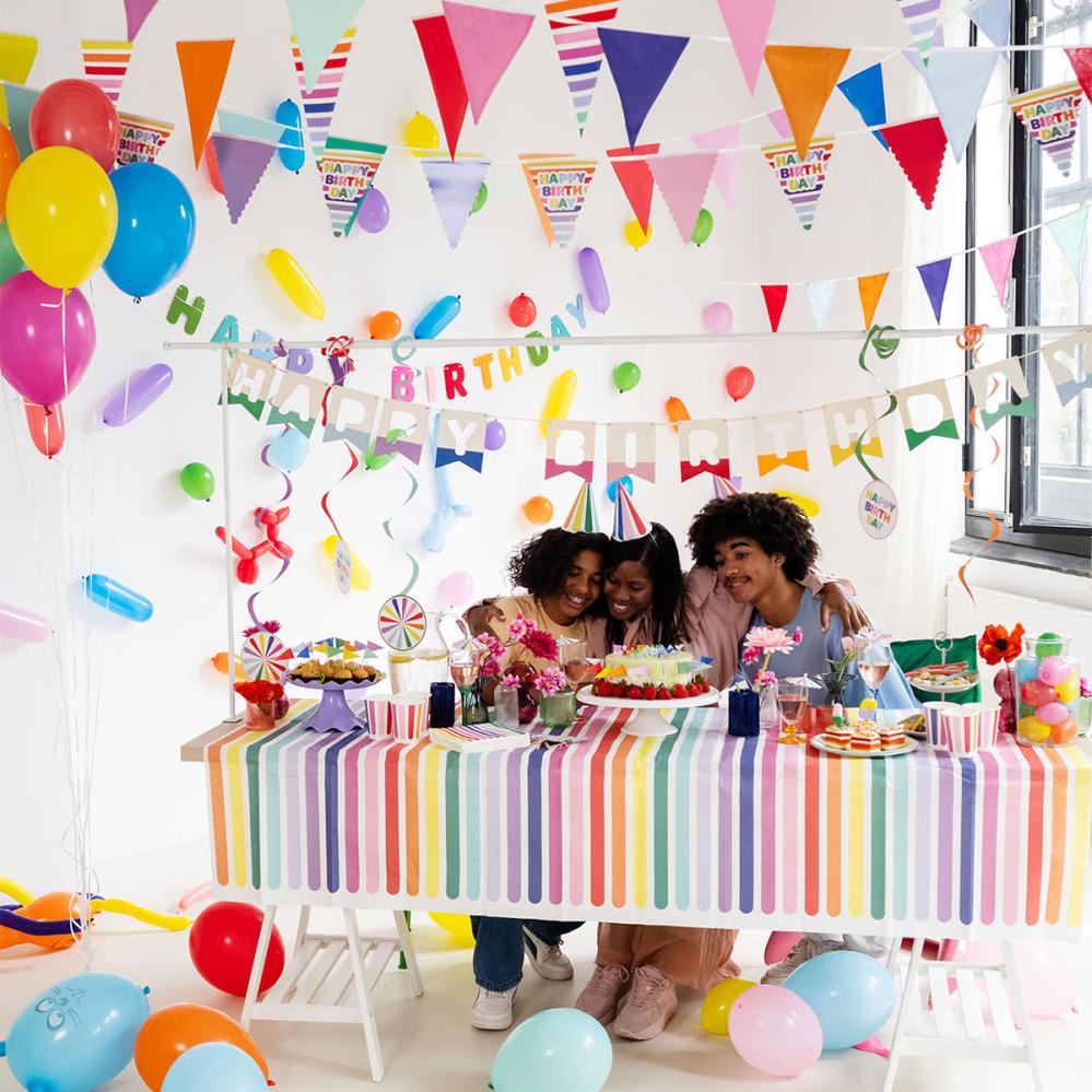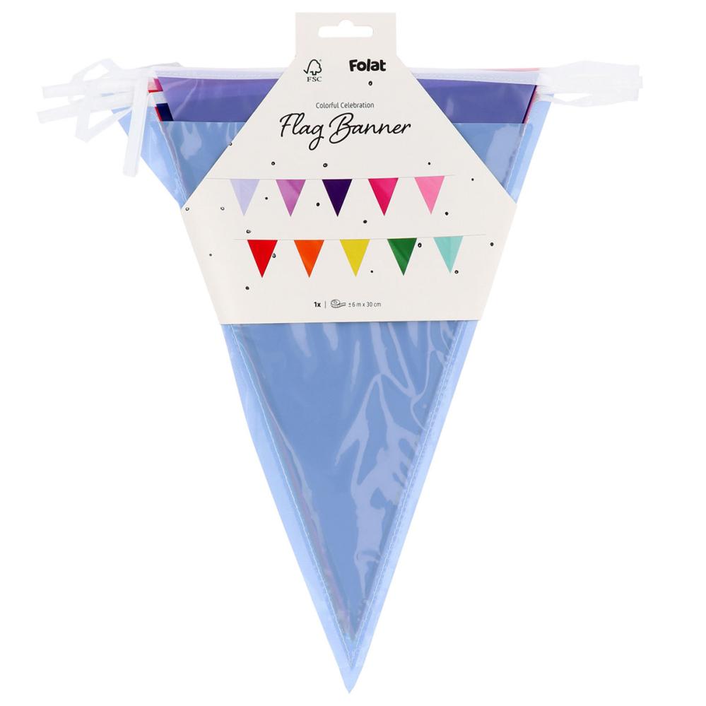 Förhøj stemningen med en farvestrålende flagguirlande i 6 meters længde. Perfekt som hængende dekoration til fest, med plads til ti farverige flag. Nem at pakke sammen og genbruge blandt dine bedste festdekorationer.
