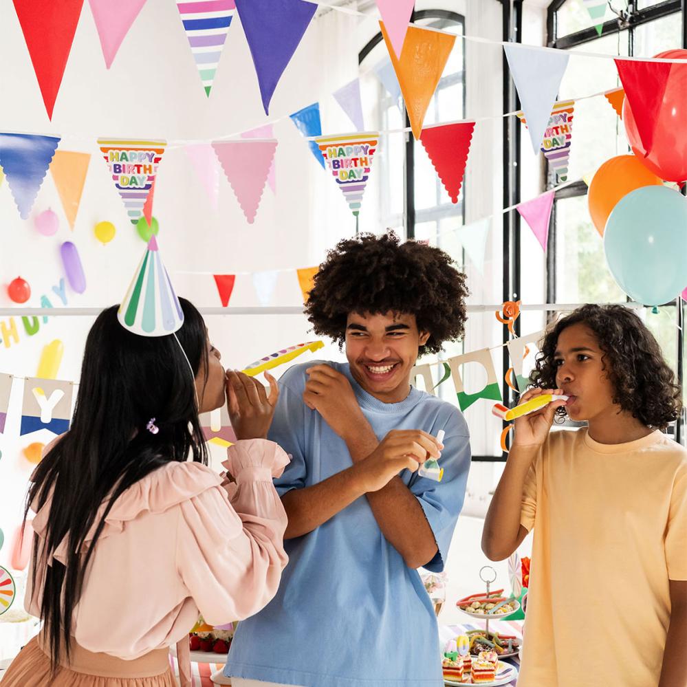 Denna färgglada flaggirland i tyg forvandler hvert rum til en fest. Den er perfekt som stofguirlande og som smart hængende dekoration til fest, takket være sin praktiske opbevaring. Den er et must blandt dine festdekorationer til både børn og voksne.