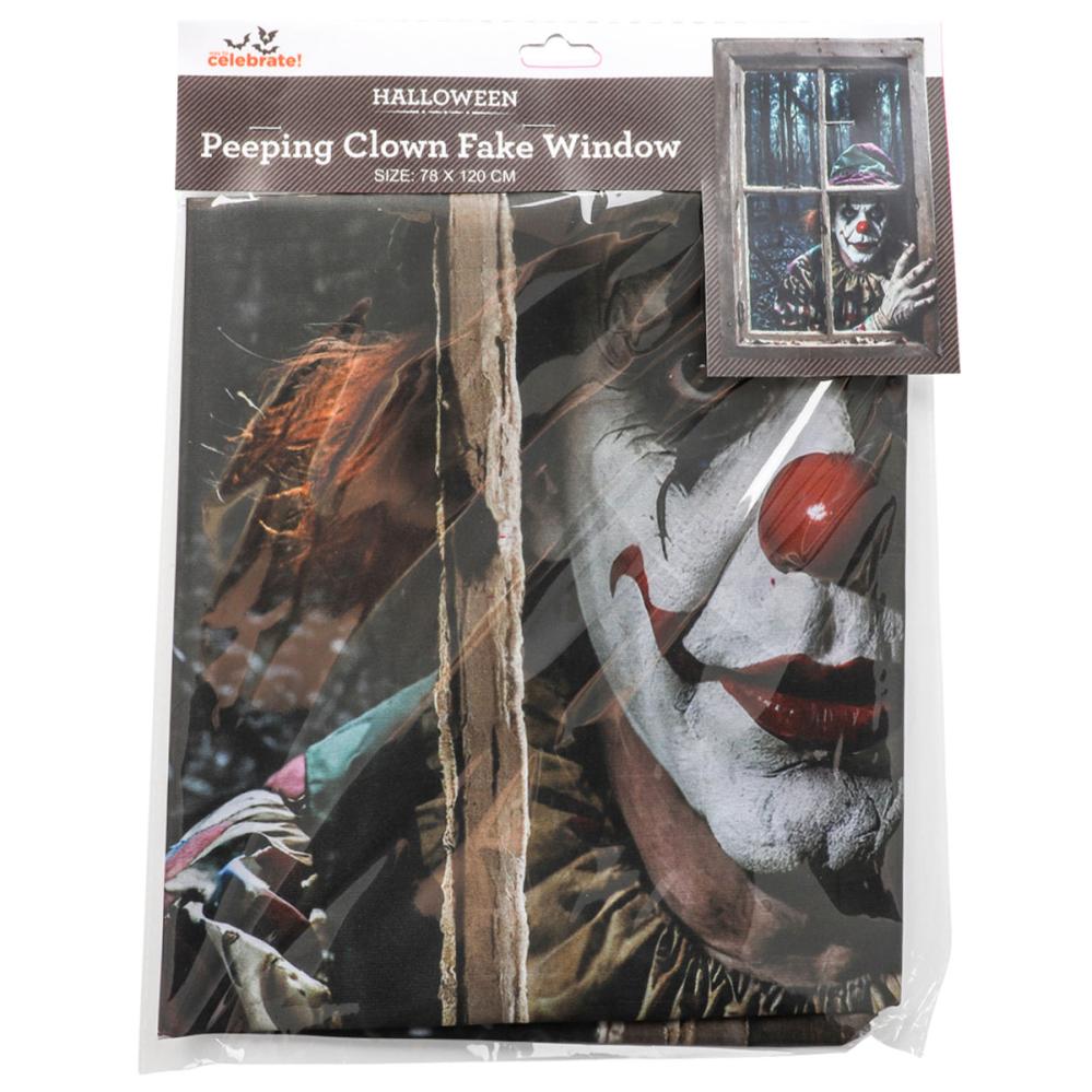 Vinduesdekoration Halloween Uhyggelig Klovn består af en stofdekoration med motiv af en uhyggelig klovn mod en naturbaggrund. Dekorationen hænges på indersiden af vinduet med motivet indad og skaber illusionen af, at klovnen kigger ind gennem vinduet.