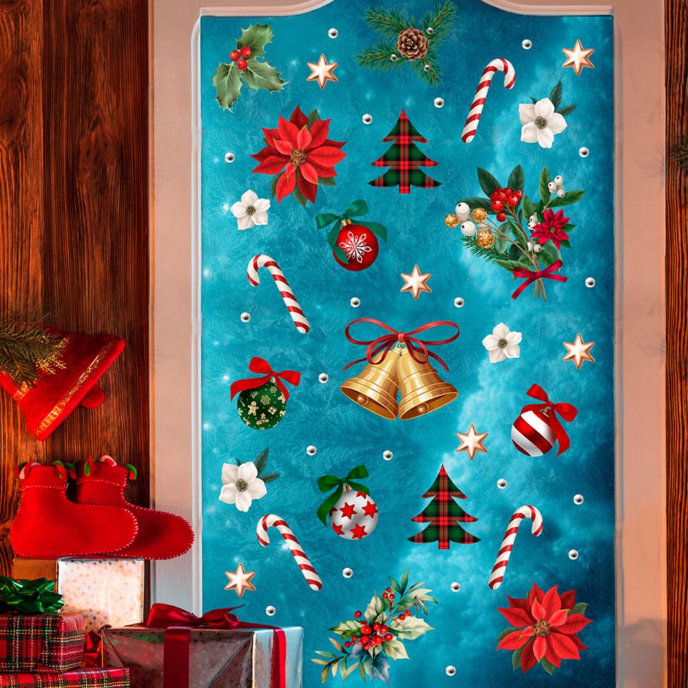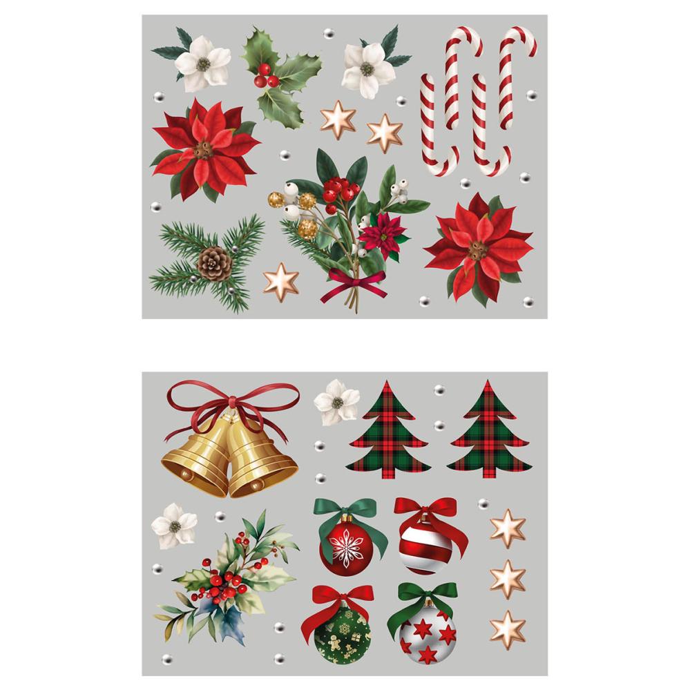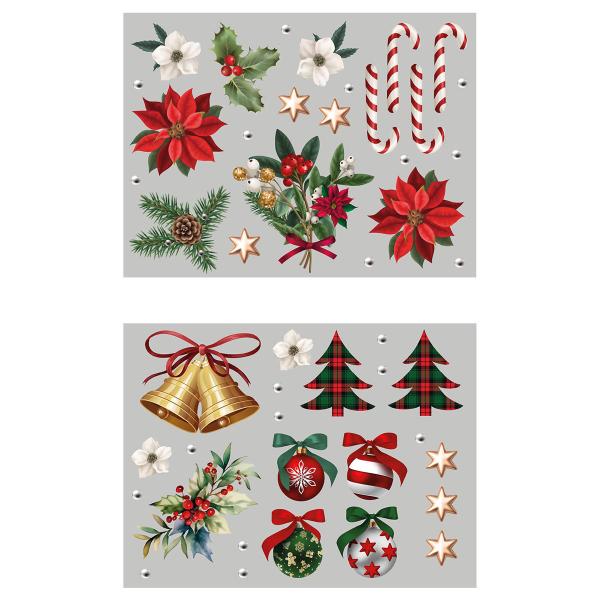 Vinduesklistermærker med Julemotiv omfatter to store ark med traditionelle julemotiver af juleblomster, bolsjestænger, julek lokker, julekugler og stjerner.
