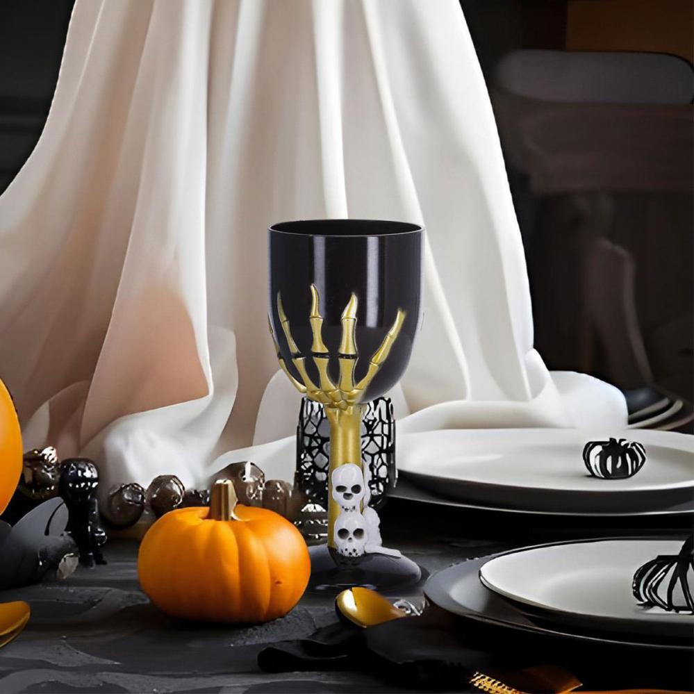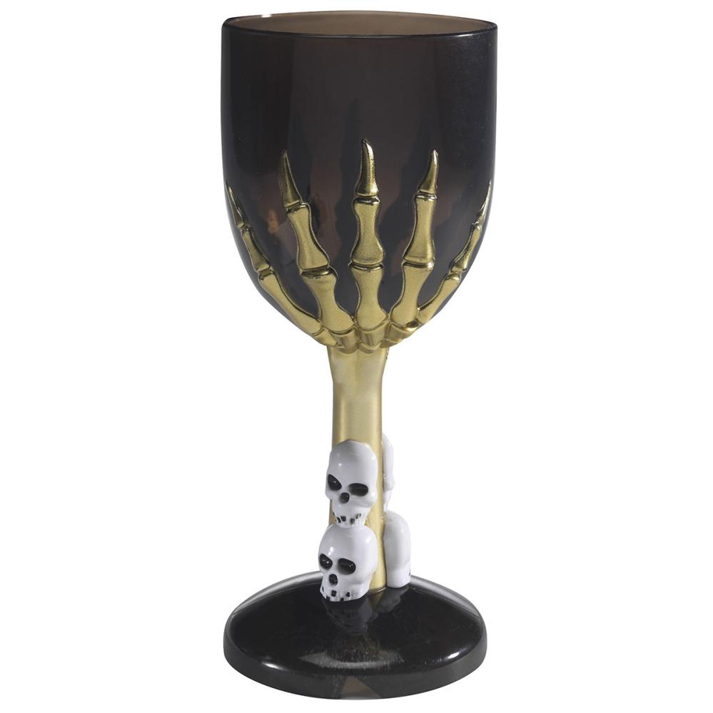 Vinglas med Skelethånd er lavet af plastmateriale og omfatter et skinnende sort vinglas med en sølvfarvet skelethånd.