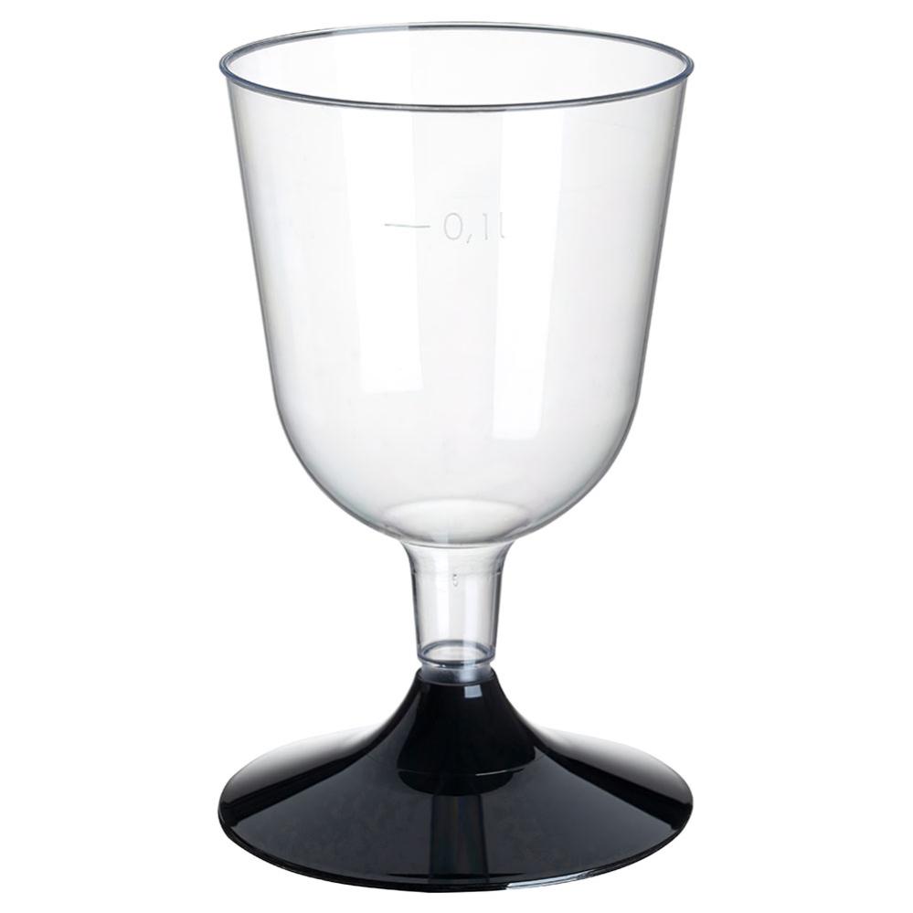 Vinglas Transparent/Sort omfatter tyve plastikglas til hvidvin. Glasset er gennemsigtigt med en sort fod. Det rummer cirka 0,1 liter og dets samlede højde er cirka 12 centimeter.