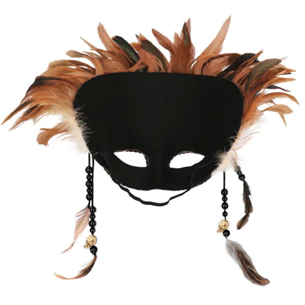 Voodoo Halvmaske med Fjer omfatter en halvmaske som holdes på plads med et sort elastisk bånd og har voodoomotiv. Masken er dekoreret med sorte fletninger og har udstikkende fjer i hvide og brune nuancer. På siderne af masken hænger der sorte perler, dødningehoveder i beige nuancer samt fjer.