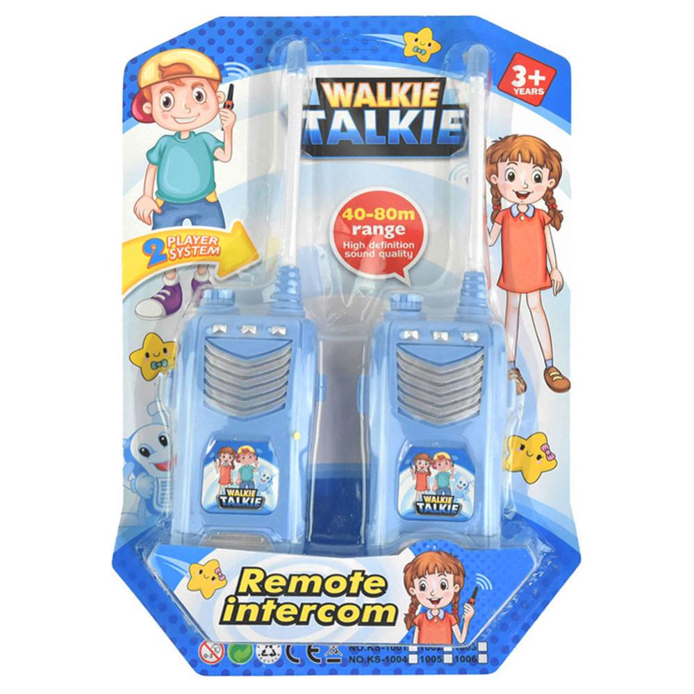 Walkie Talkie Legetøj indeholder et sæt med to walkie talkies til børn. Disse walkie talkies er udstyret med fleksibel antenne, mikrofon og højttaler, push-to-talk knap samt en on/off-knap. De er ca. 24 cm store og drives af et 9V-batteri hver. Fremstillet af plast.